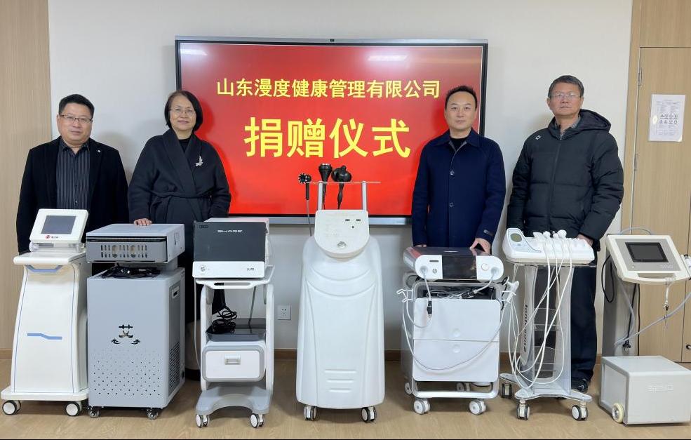 爱心企业进校园,产教融合传温暖。为进一步深化校企合作,提升产教融合效果,山东漫度健康管理有限公司向医养健康学院捐赠了艾烟净化器、无创水光仪等7台实训设备,总价值超过20万元。山东漫度健康管理有限公司代表杨杰、医养健康学院领导参与本次捐赠仪式。