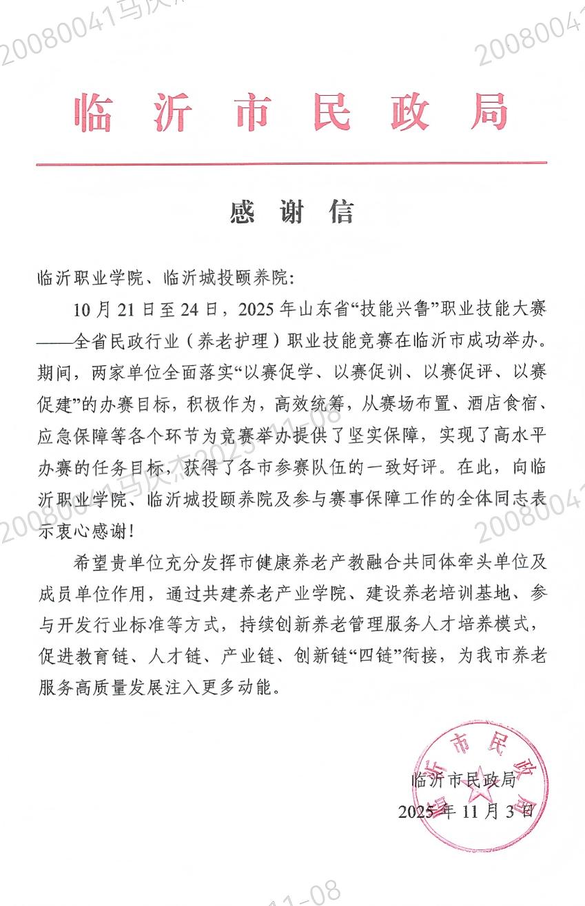 近日,我校收到来自临沂市民政局的感谢信,信中对学校在承办2025年山东省“技能兴鲁”职业技能大赛——全省民政行业(养老护理)职业技能竞赛期间所提供的高水平、全方位保障工作给予了高度评价并表示衷心感谢。