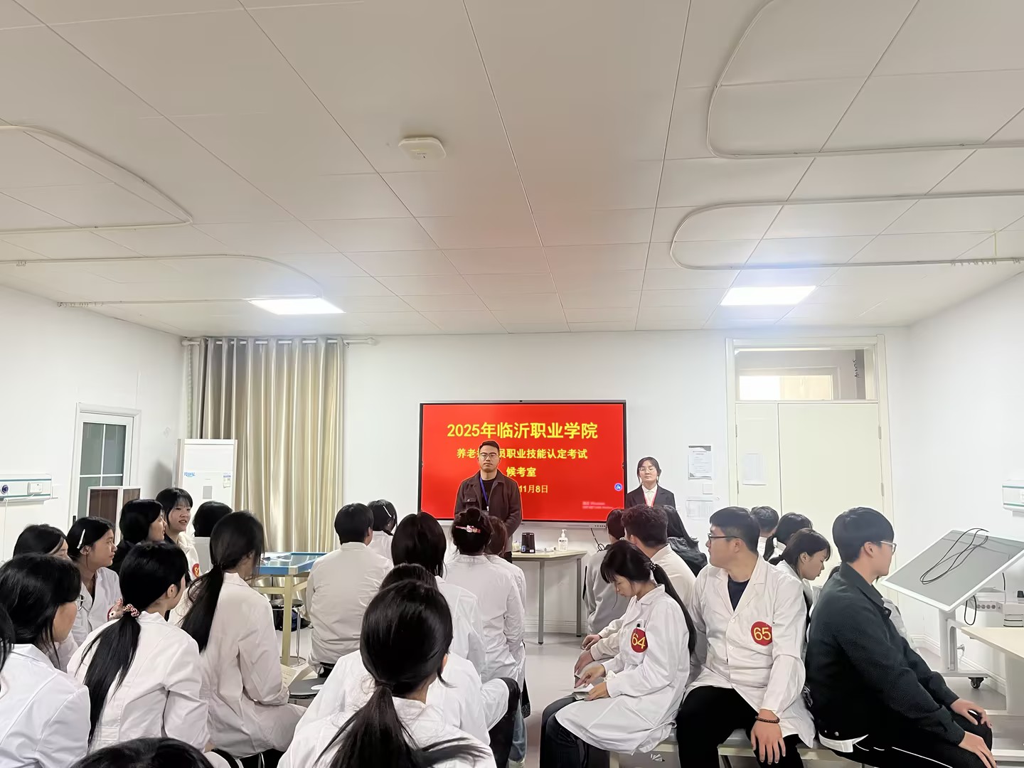 考试全程接受临沂市人社局现场监考与督导,严格遵循国家职业技能标准,设置理论考核与技能实操两大模块。技能实操环节分候考室、备考室、技能考场三阶段推进,创新采用真人SP老人模特模拟真实场景,全面考察考生核心技能。近50名教职工及志愿者全程保障流程规范有序。